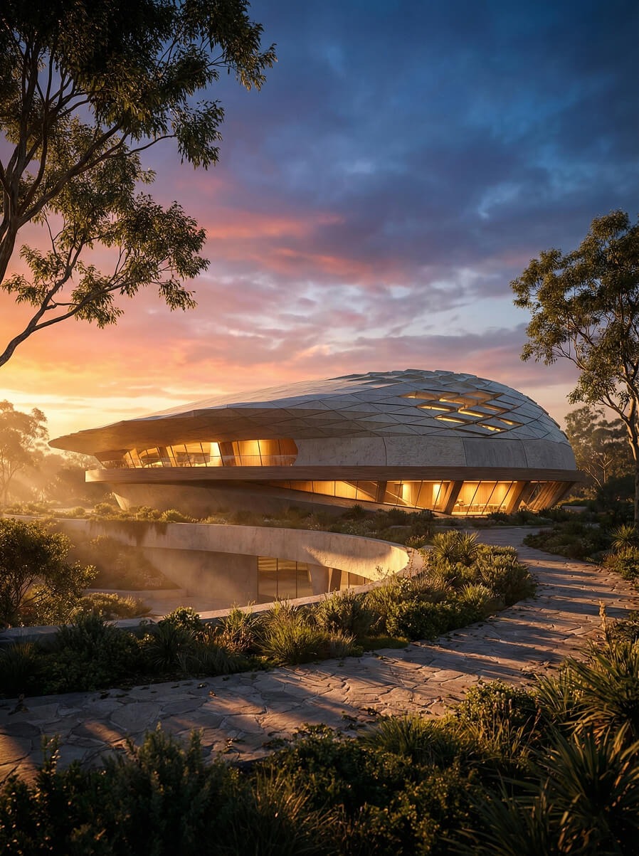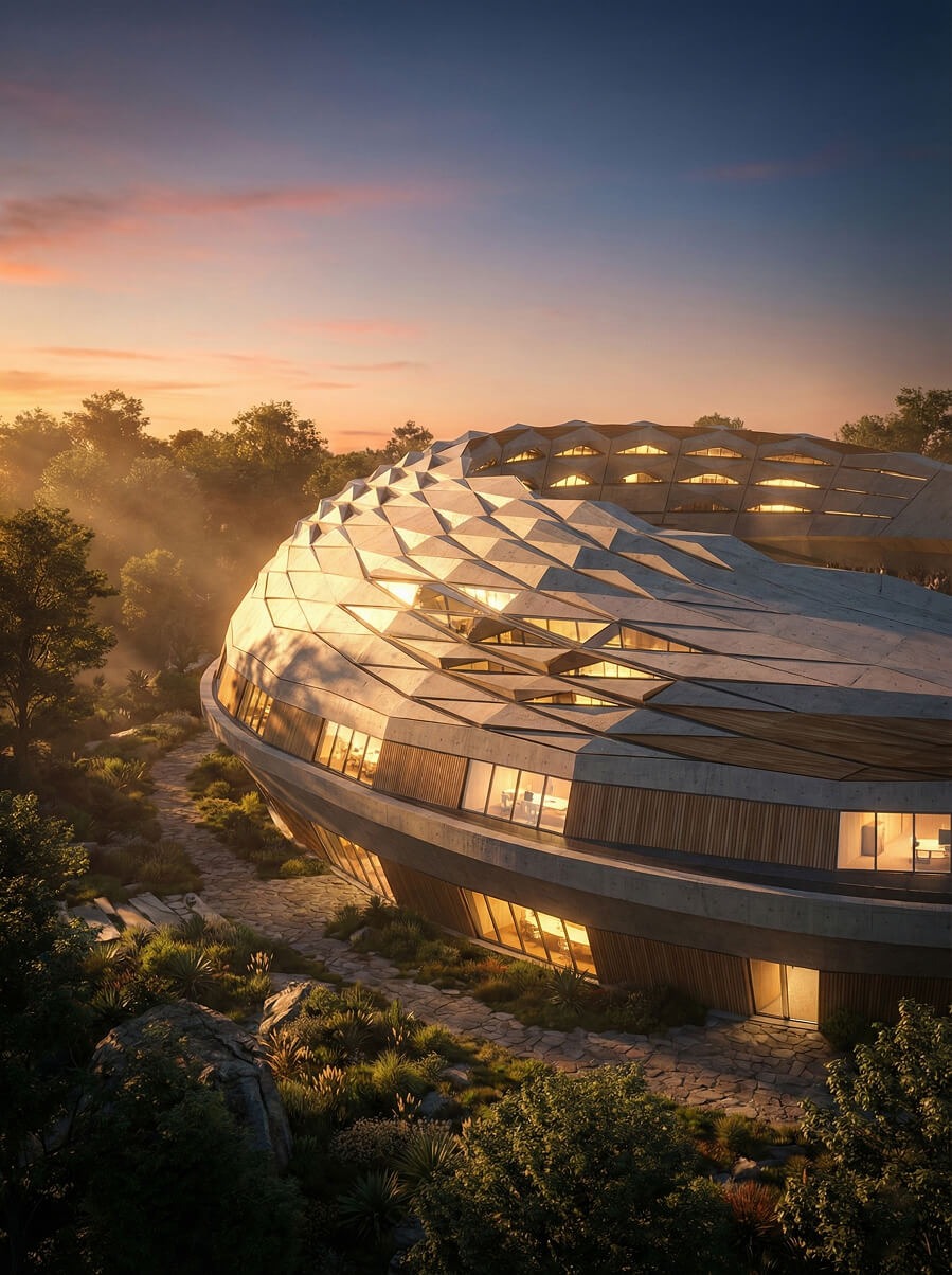 🟣 Model Diverse Architectural Typologies: Apply specific workflows (Subdivision Surfaces, Symmetry, and Polygonal modeling) to construct five distinct structures ranging from rigid Seaside Villas to fluid, Organic Stadiums.