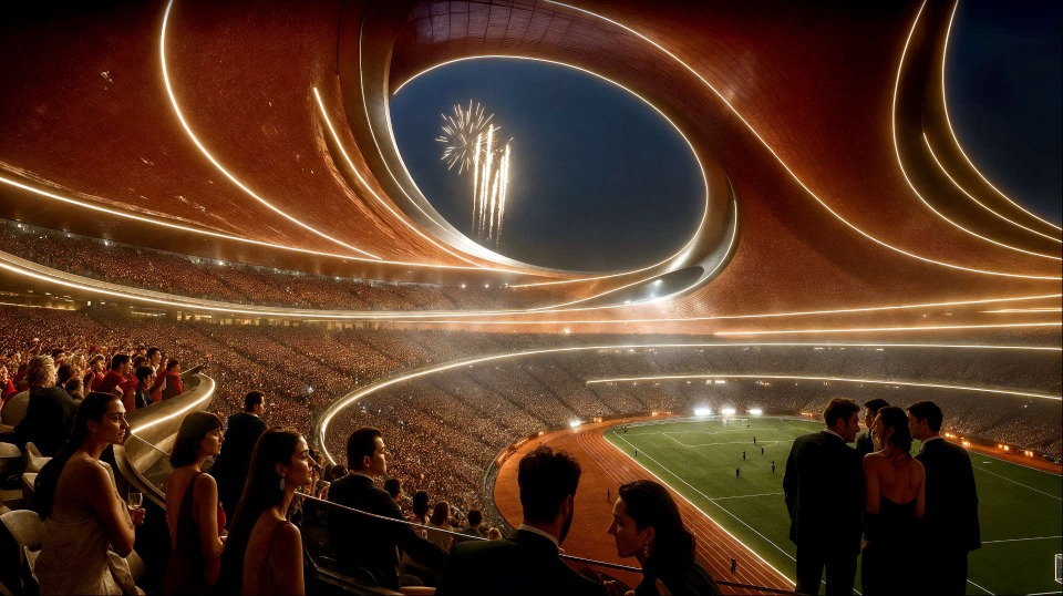 Create a captivating, 60 to 90-second AI-generated film that brings a next-generation stadium to life. The video will seamlessly merge the raw power of on-field action and the electric emotion of the tribunes with the sophisticated lifestyle of its luxury VIP lounges. Through dynamic motion, the piece will showcase the stadium's exquisite architecture and designer interiors, all driven by a powerful score, immersive sound effects, and integrated characters to capture its unique mood and iconic character.
